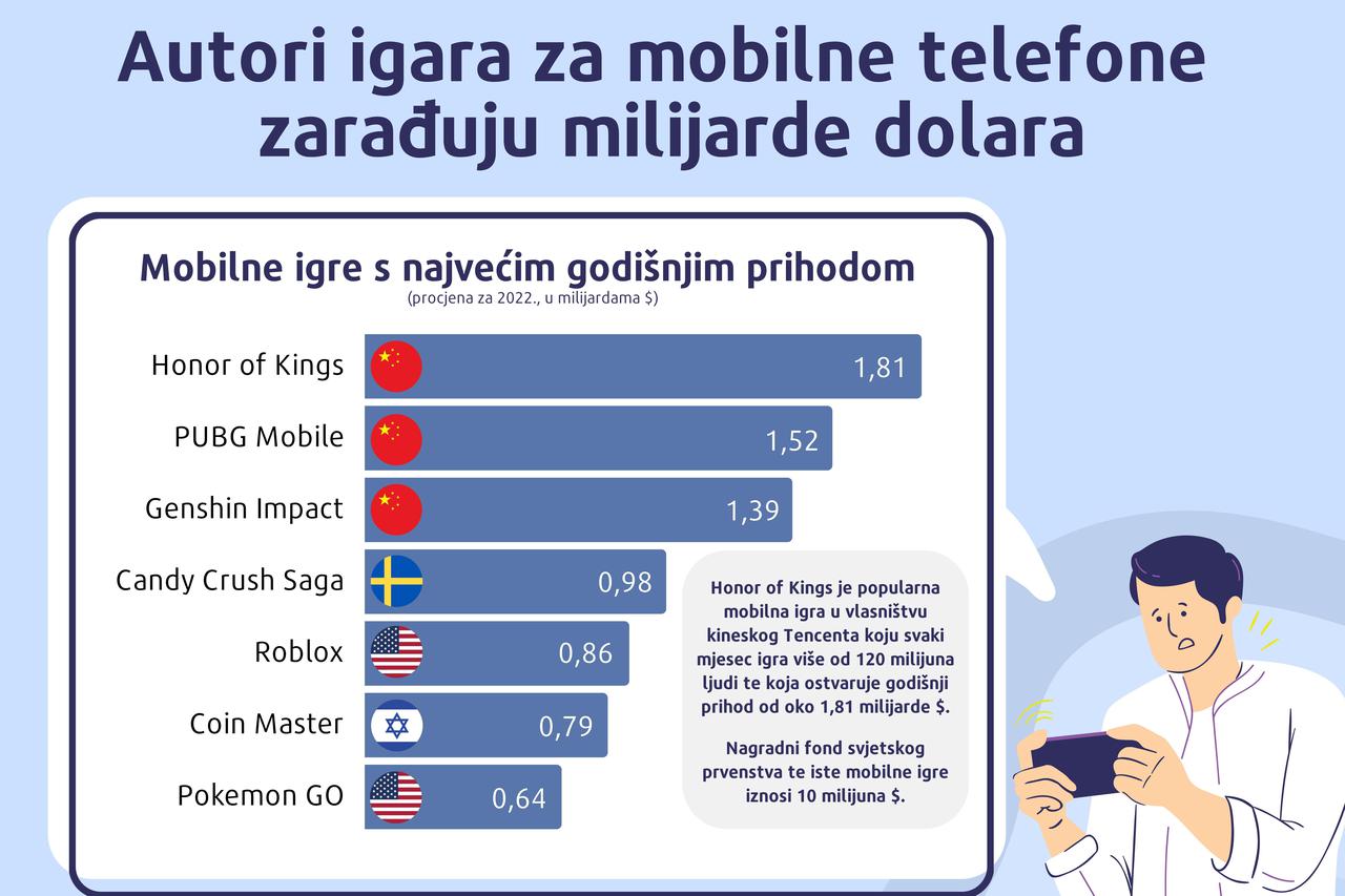Infografika prikazuje mobilne igre s najvecim godisnjim prihodom. Honor of Kings je popularna mobilna igra u vlasnistvu kineskog Tencenta koju svaki mjesec igra vise od 120 milijuna ljudi te koja ostvaruje godisnji prihod od oko 1.81 milijarde dolara. Nagradni fond svjetskog prvenstva te iste mobilne igre iznosi 10 milijuna dolara. Na drugom mjestu nalaze se […]