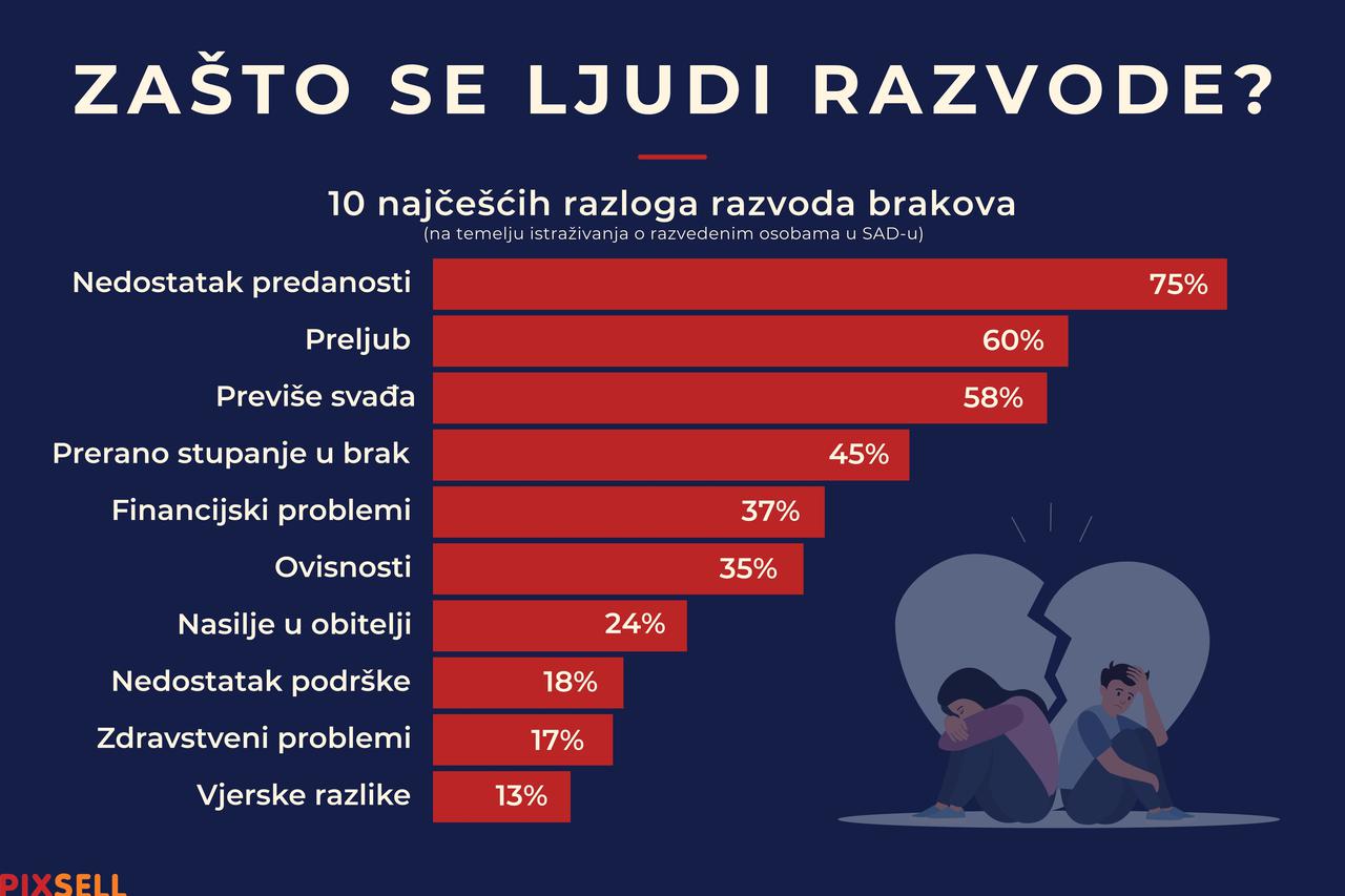 Infografika pokazuje 10 najčešćih razloga razvoda brakova na temelju istraživanja o razvedenim osobama u SAD-u. Nedostatak predanosti najčešći je razlog za razvod, a slijede ga preljub te previše svađe.