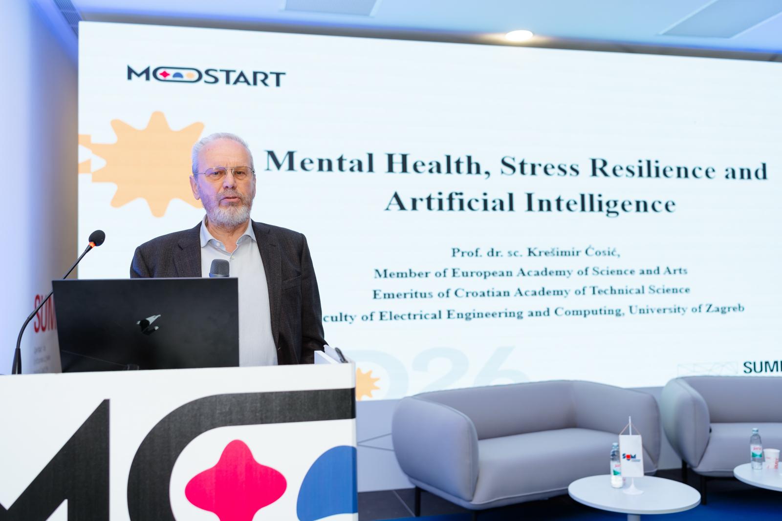 Predavanje pod naslovom „Mentalno zdravlje, otpornost na stres i umjetna inteligencija“ održao je prof. dr. sc. Krešimir Ćosić sa Sveučilišta u Zagrebu. Mentalno zdravlje u izlaganju je prikazano ne samo kroz kliničku perspektivu, već i kao skup kognitivnih i emocionalnih sposobnosti koje omogućuju učinkovito funkcioniranje u zahtjevnim i nepredvidivim okruženjima.