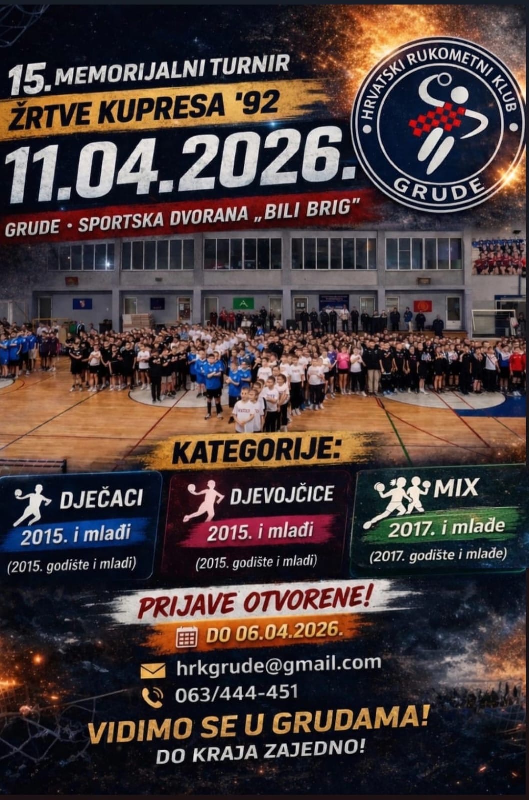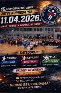 GRUDE – Sportska dvorana “Bili Brig” 11. travnja 2026. godine bit će domaćin 15. Memorijalnog rukometnog turnira “Žrtve Kupresa ’92”, događaja koji već godinama okuplja veliki broj mladih rukometaša i rukometašica iz cijele regije.